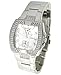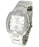 Add some severe glamor to your day-to-day with this sparkling GUESS watch. Stainless steel case, base steel bezel. Folding push button closure. Three-hand analog movement with two multifunction dials with day and date. Swarovski crystal bezel.