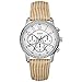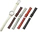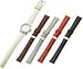 Mother-of-pearl dial with luminous silver-tone hands, hour markers and Arabic numeral 12; crystal outlined heart on dial; blue cabochon on crown; red, black, brown and pearl grey interchangeable shiny leather straps included; special edition.Water-resistant to 330 feet (100 M).Precise Swiss-quartz movement.Durable flame-fusion crystal; stainless steel case; shiny beige leather strap.Date function. Get a new look instantly --