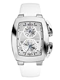 Make a stylish statement with a sleek, white watch. Polished steel case and white leather band. Dual-counter precision.