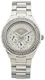 Case Diameter - 35 MM. Elegant everyday style punctuated with sparkle. Stainless steel case. Silver-tone bracelet. Three-hand analog quartz movement with three sub-dials. Crystals on bezel and dial. Water resistant to 50 meters/160 feet.
