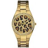 Case Diameter - 39 MM. Time to upgrade to a cool, modern look. This Guess watch has a leopard print dial set in a sleek gold-tone case. The gold tone band is finished with a jewlery clasp. It's a great casual accessory that's versatile enough to wear every day.