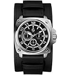 Water resistant.Accessory.Men's trends.Watch.Cuff style. A trendy sport watch that has it all! This oversized style with a multi-function movement features a silver-tone case with 4 screw-like details and a black dial that compliments the multi-layered black cuff.