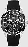 44mm Case Diameter.Mineral Crystal.100 Meters / 330 Feet / 10 ATM Water Resistant.Quartz Movement. Time to upgrade to a cool, modern look. This Guess watch has a black dial set in a sleek silver-tone case. The black silicone band is finished with a buckle clasp. It's a great casual accessory that's versatile enough to wear every day.