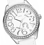 100% Authentic Guess Watch for Women. White Dial with Crystal Encrusted Inlay Hour Numbers and Guess Question Mark on 5:00. Round Silver Tone Casing with Shimmering Rhinestones. White Genuine Leather Band with Buckle Closure. Water Resistant. Japan Movement.
