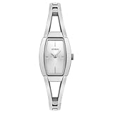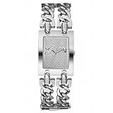 Case diameter: 19 mm.Water-resistant to 99 feet (30 M).Stainless-steel case; Silver dial.Mineral crystal.Precise Japanese-Quartz movement. This stainless steel watch from GUESS thrills with its alluring lines and sensual shape. The gently curved, stainless steel band is secured in back with a delicate bangle bracelet clasp. From the clasp it is fabricated of 12-millimeter links that fork into two solid lines that slowly widen as they reach the face, finally encompassing and framing the 19-millimeter watch case. The bright silver dial has a long rectangular shape with convex sides and features a simple complement of four silver indexes and silver hands, driven by analog-quartz movement. The dial is protected by a mineral crystal and the entire watch is water resistant to 99 feet.