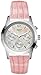 Case Diameter - 35 MM. Sweet sporty style by GUESS. This chic watch features a textured pink leather strap and round silvertone mixed metal case. Mother-of-pearl chronograph dial with logo, silvertone stick indices and three subdials. Quartz movement. Water resistant to 100 meters.
