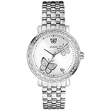 A flirty and fun feminine timepiece. Round sunray white face with silver tone casing encrusted with crystals around the edge. Crystal embellished butterflies on face. Shiny silver tone metal adjustable link band.