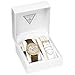 35mm Case Diameter.Mineral Crystal.100 Meters / 330 Feet / 10 ATM Water Resistant.Quartz Movement. You know that watches are about so much more than telling time. Make your statement with this GUESS watch Rock Candy set. Interchangeable metallic brown and white leather straps and round goldtone mixed metal case. Bezel embellished with two rings of crystal. White dial features goldtone stick indices, numeral at twelve o'clock, three subdials and logo. Quartz movement.