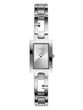 Case diameter: 17 mm.Water-resistant to 99 feet (30 M).Mineral crystal.Precise Japanese-Quartz movement.Stainless-steel case; Silver dial. Sleek and polished with a funky twist, the stainless steel watch from GUESS will let you show off your sense of style. This analog-quartz-powered watch features unique logo-style, G-shaped links of stainless steel that make up the band, which is secured with a bangle bracelet clasp. A simple 19-millimeter stainless steel case and bezel surround the silver dial, protected by a mineral crystal. The dial is streamlined, with only slender silver hands and a light pattern of lines radiating from the center. This watch is water resistant to 99 feet.