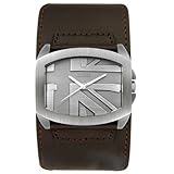 Durable mineral crystal; Antique silver-tone base metal case; Brown leather strap.Leather cuff strap.Antique silver-tone dial.Silver-tone hands.Precide, high-quality Japanese-Quartz movement. Unique yet distinctly contemporary, the GUESS? Men's Antique Silver-Toned and Brown Leather Watch boasts an oversized brown leather band that closes with a traditional buckle and a bold modified rectangular stainless steel case. This case is home to a silver-toned dial embossed with a close-up of the British flag. There are no hour markers on the dial--only silver-toned hands and the Guess namesake at the twelve o'clock position. Other features include Japanese quartz movement, a mineral crystal window, and water-resistance to 100 feet (30 meters).